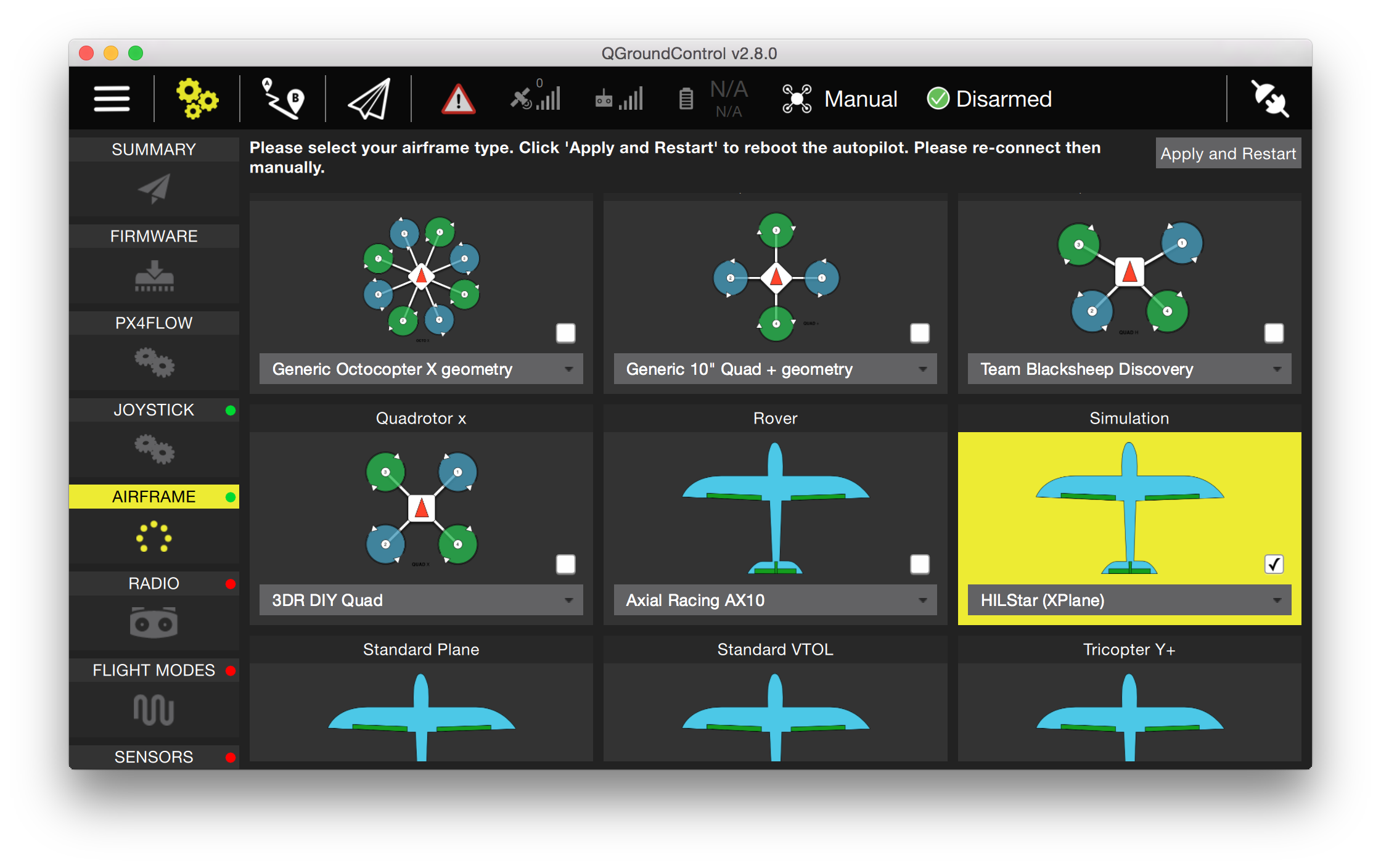Widgets -> HIL Config, then select X-Plane 10 in the drop-down and hit connect. Once the system is connected, battery status, GPS status and aircraft position should all become valid: