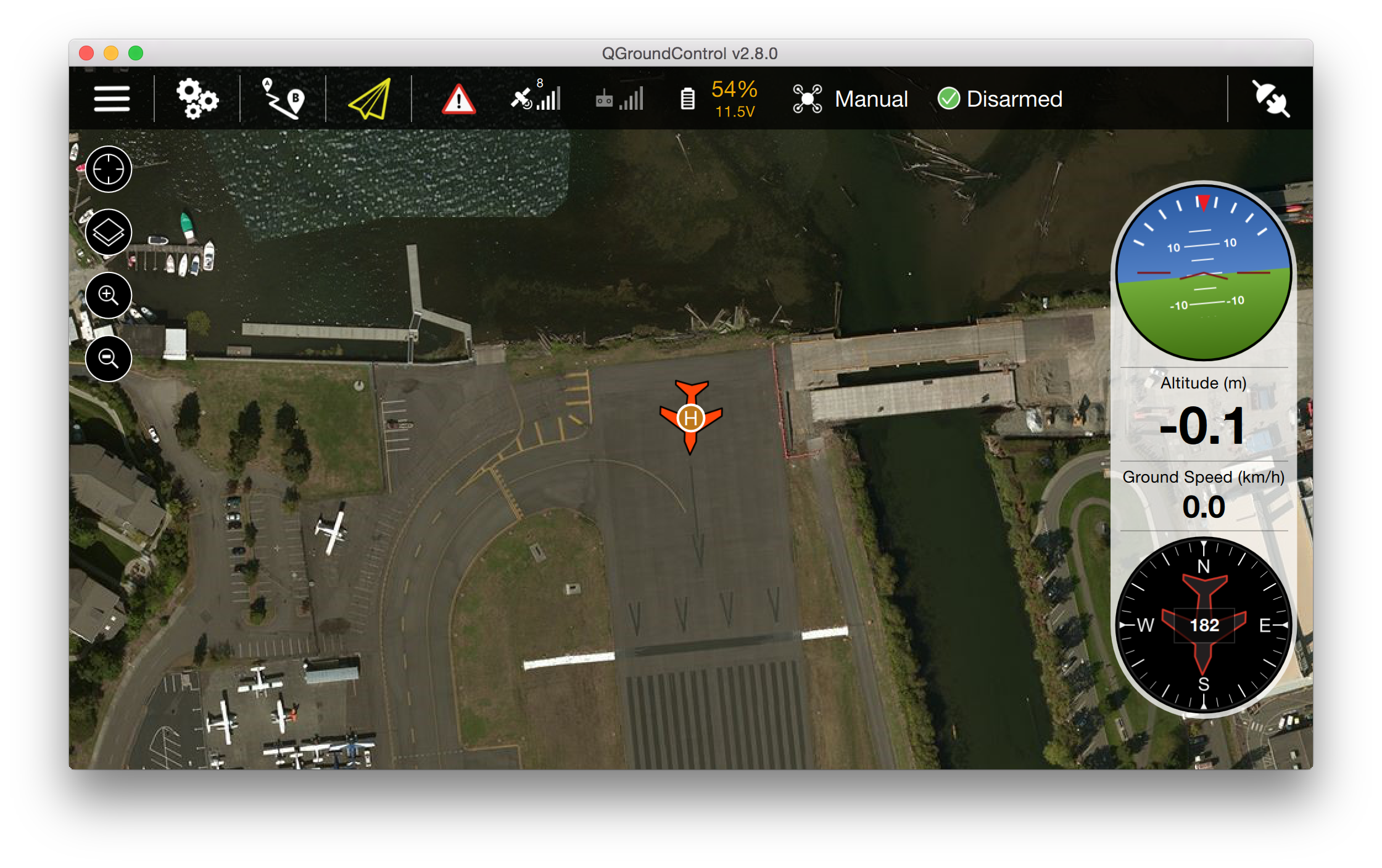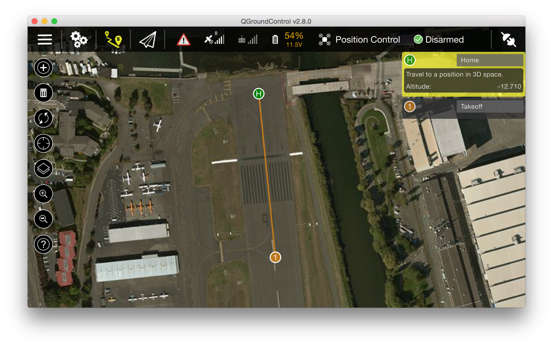 Then select MISSION from the flight mode menu in the toolbar and click on DISARMED to arm the plane. It will take off and loiter around the takeoff waypoint.